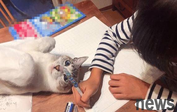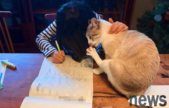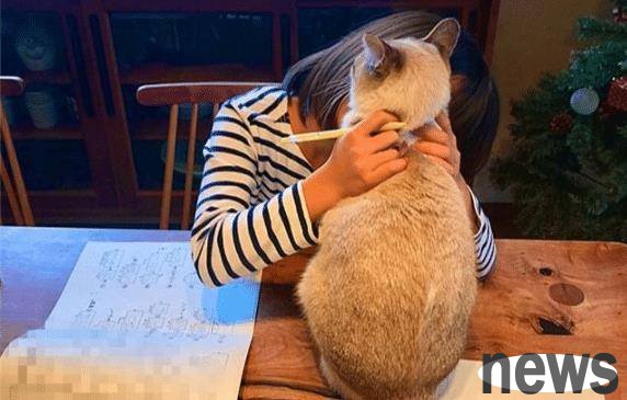Is Rio no longer making a fuss? No, it was just that her daughter was stroking it with one hand, while the other hand was still doing homework. Slowly, Rio calmed down and became quiet.