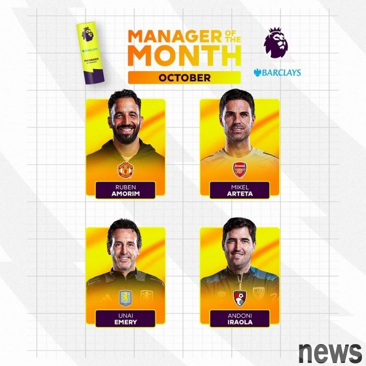 The Premier League officially announced the candidates for the Best Coach of the Month in October. Amorin was shortlisted for the first time in his career. He will compete with Arteta, Emery and Illaura for this honor. In October's Premier Leagu...