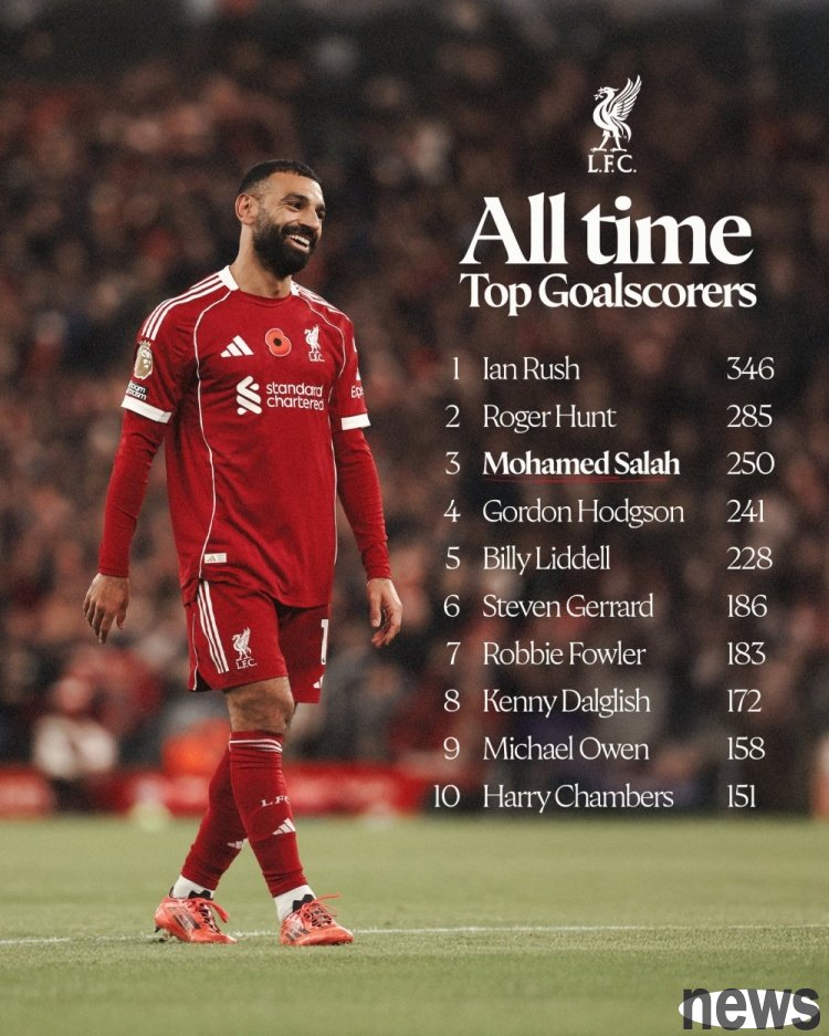 In the 10th round of the Premier League, Salah scored and Liverpool defeated Villa 2-0 at home. Liverpool’s official social media released the team’s history of scorers. Salah ranked third with 250 goals, 96 goals behind the leader Ian Rush. Liverpo...
