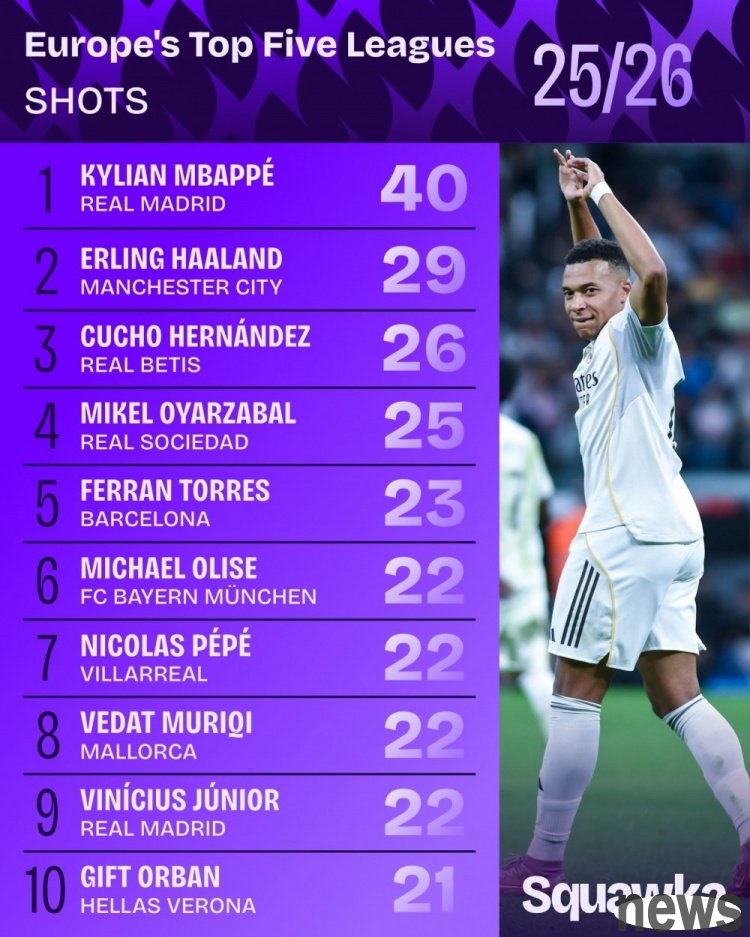 Squawka counted the number of shots taken by players in the five major European leagues so far this season. Real Madrid forward Mbappe ranked first with 40 shots, and Haaland ranked second with 29 shots. The top ten players in the five major Europea...
