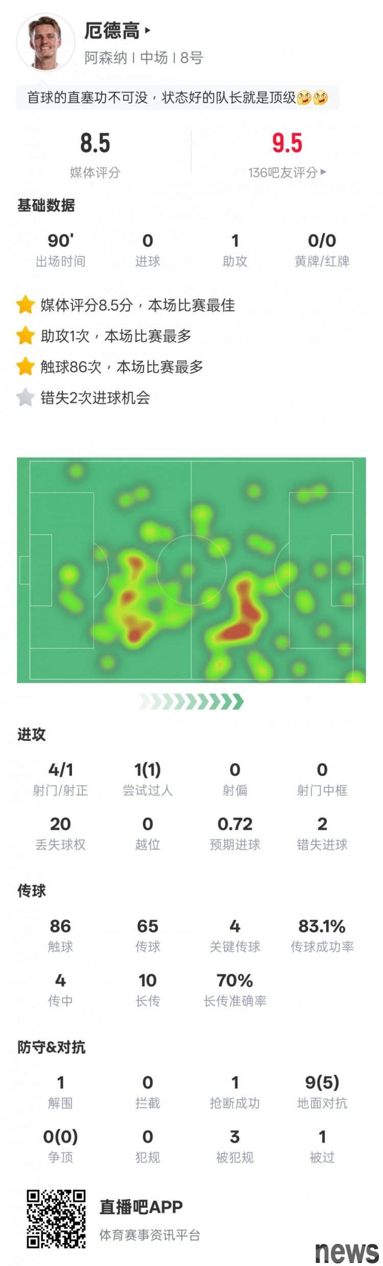 In this game, Odegao played the whole game for Arsenal and gave 1 assist. Arsenal officially announced that after the fans' vote, Odegao was elected the best player in the team in this game.