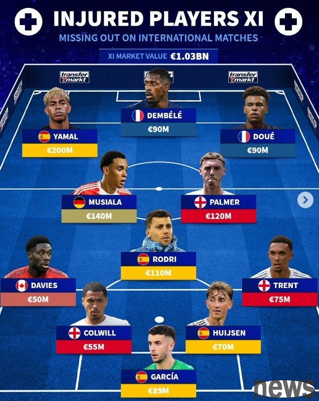 On this international match day, many heavyweight stars were unable to represent the national team due to injuries, including new Golden Globe winner Dembele, Yamal and other players. The German transfer market has taken stock of the most valuable players who have missed the national team due to injury. Dembele, Yamal, Rodri, Palmer and Musiala are on the list.