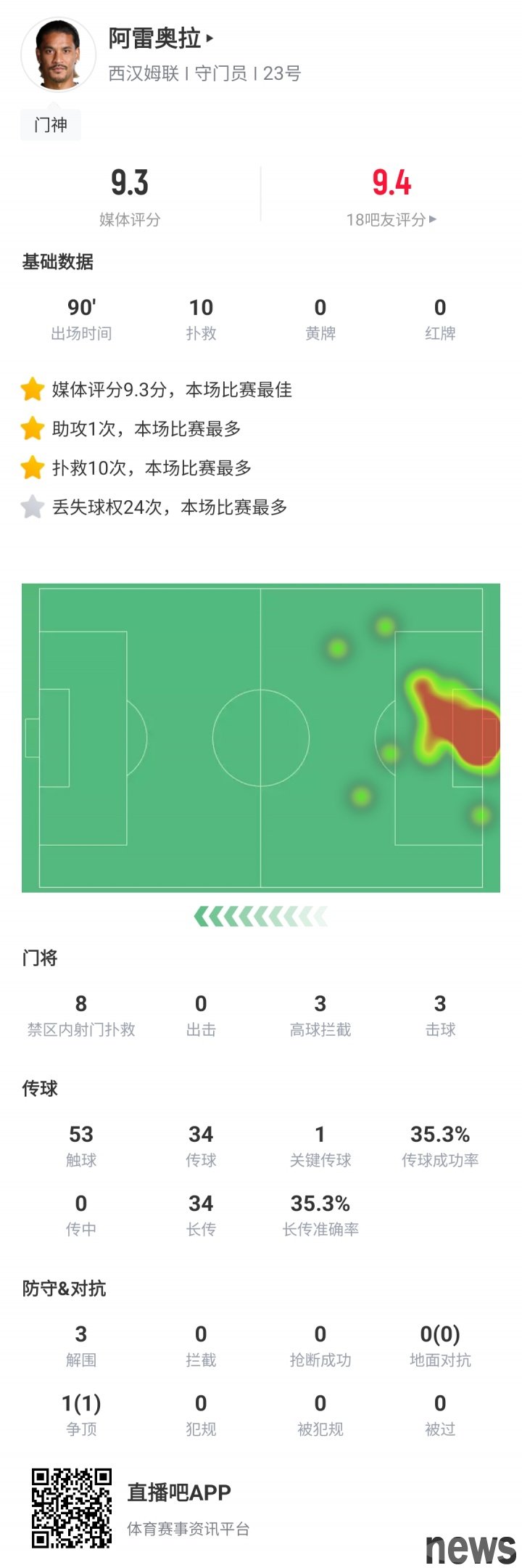 In the 12th round of the Premier League, Bournemouth drew with West Ham United 2-2. In this game, West Ham United goalkeeper Areola made 10 saves and had 1 assist. The media score was as high as 9.3 points, helping the team score 1 point. Arreola...