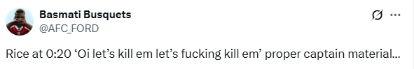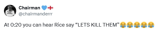 Arsenal defeated Tottenham 4-1 in the North London Derby. In the game footage released by Sky Sports after the game, many fans heard Rice's shouting after the team scored in the video.
